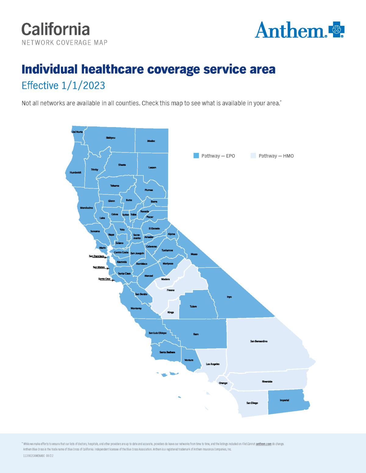 앤섬 블루 크로스는 다음과 같은 EPO 플랜과 HMO 플랜을 캘리포니아 전역에서 제공합니다.